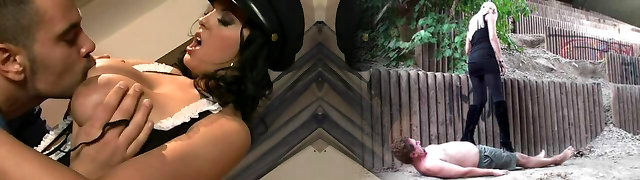 Huge-titted dark-hued slut in a police uniform absorbs a strong cock with her creamy pussy.