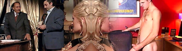 Fabulous blonde bimbo in ebony undergarments gets on her knees for wild blowbang action