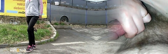Straight haired goth chick pulls down black jeans to pee at the bus parking