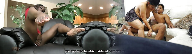 Asian hottie in black stockings sits on the sofa and gives an aged guy a great feetjob