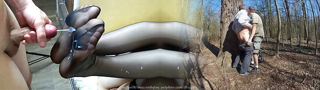 Handjob in Black Pantyhose and Soles Fuck - Cum on Nylon Feet