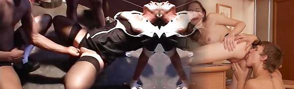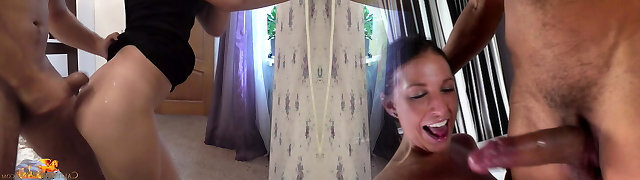 Sexy young dark haired skank gets fucked and licked by two big schlong black guys