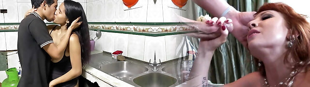 Amateur couple have romp in the kitchen while their stepparents are away.