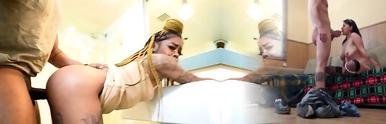 Curvy enticing chocolate masseuse takes BBC owner to the shower