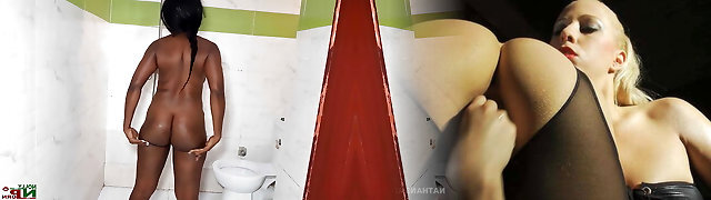 Two girl aiming their honeypots to piss on guy's face, human toilet.