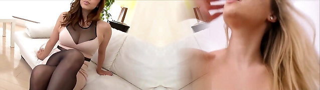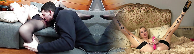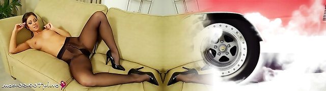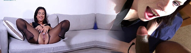 dunkelhaarige milf ava streichelt schwarze strümpfe auf ihrer couch