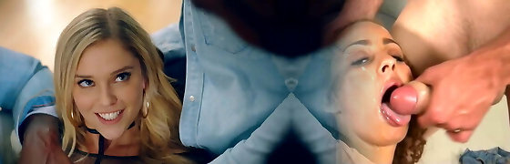 Delightful blonde babe is sucking many black cocks, one after the other and licking some fresh jizm