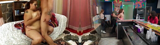 Chubby slut gets caned cream licked off of her body by skinny buddy