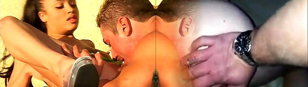 Beautiful blonde in heels gets choked and smashed in the ass by her dark-hued man