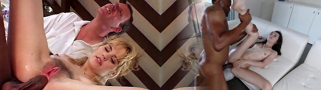 Gorgeous horny blonde honey takes two huge black cocks